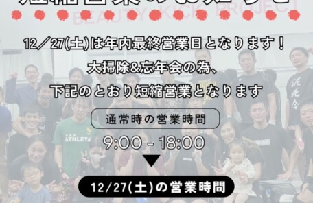 年内の営業は12/27(土)まで!27日は13:00までの短縮営業!
